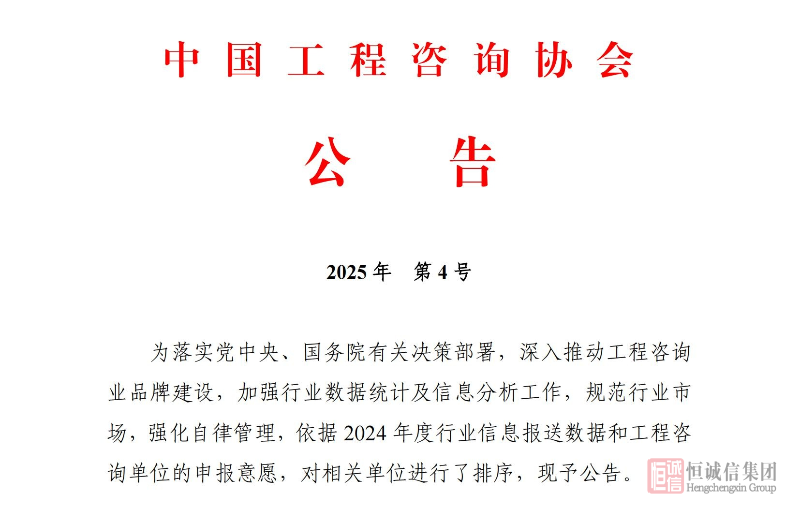 恒誠信國際工程咨詢有限公司榮登中國工程咨詢協(xié)會(huì)兩項(xiàng)百強(qiáng)榜單